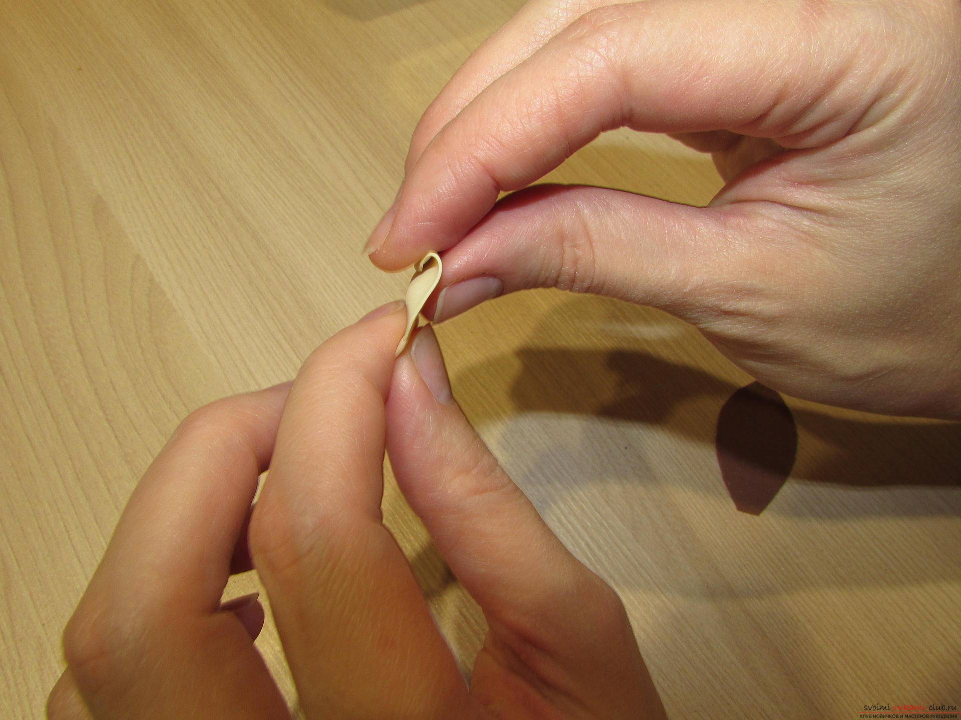 Заворачиваем кончики к серединке и прижимаем пальчиками, удерживая до полного склеивания.