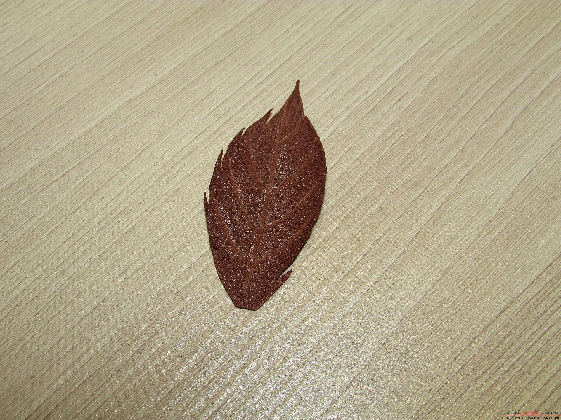 - Листочки тоже требуется прикладывать к утюгу, чуточку скручивая пальцами верхушку, и на нем зубочисткой рисуете прожилки;