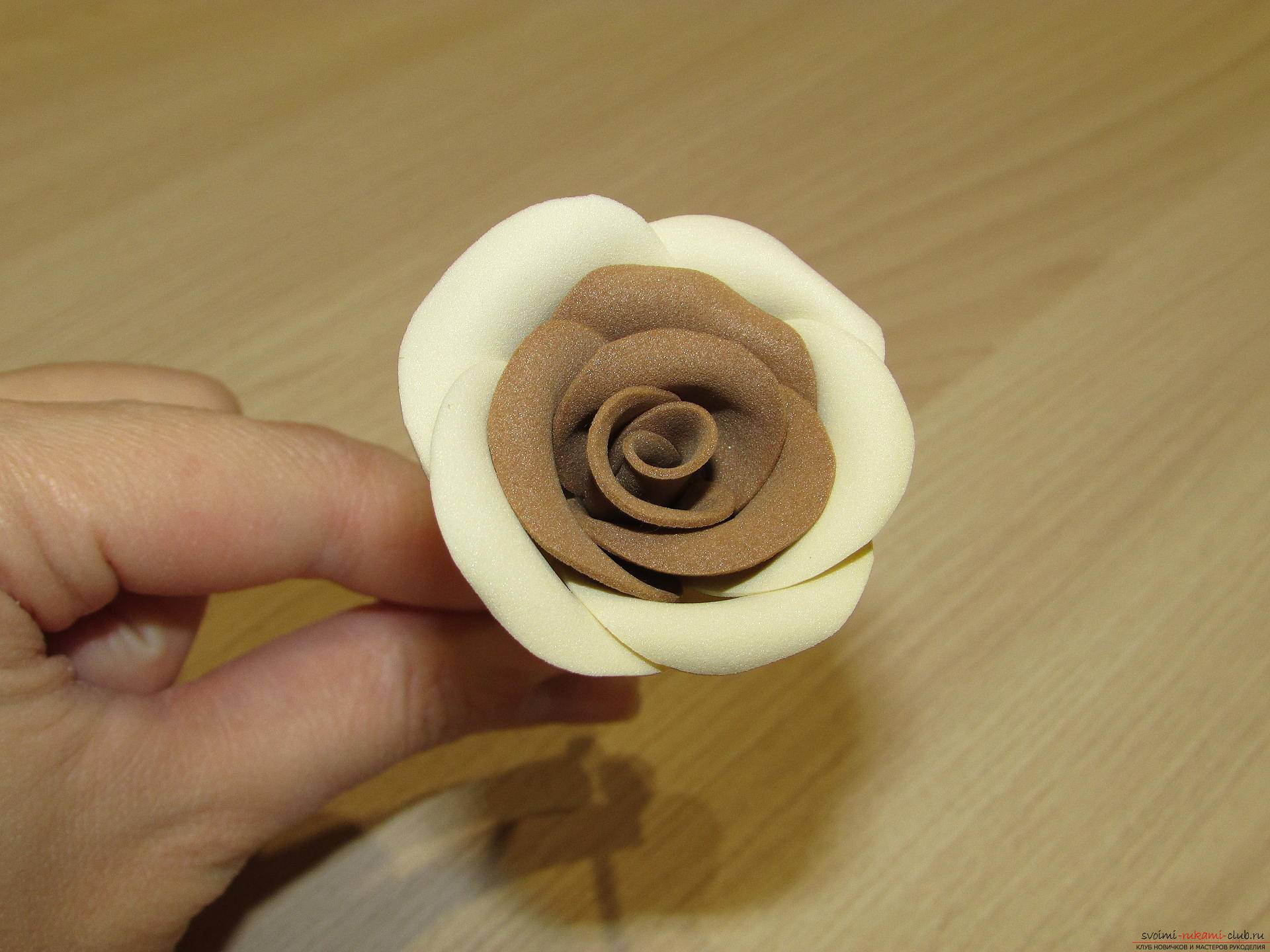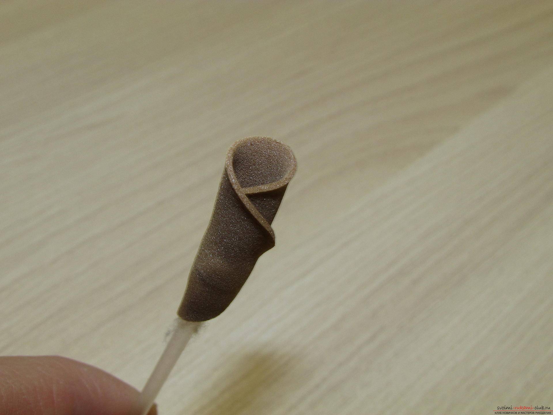Розы будут состоять из двух цветов – внутренней кофейной части с молочными краями. Верхушечку ватной палочки оборачиваете лепестком, фиксируете клеем. И так, лепесточек за лепестком, в шахматном порядке начинаете собирать цветок.