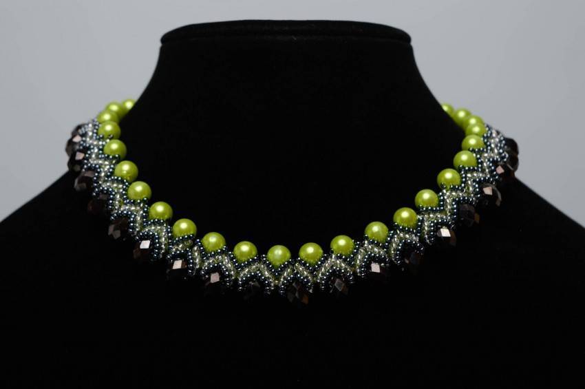 Кроме бисера в этом украшении можно использовать камни (опал, аметист, хризолит, лунный камень), бусины, жемчуг (круглый и продолговатый), кристаллы. Для основы чаще всего используется леска. Застежка должна быть удобной и крепкой. Когда со схемой определились, материалы подготовили, можно приступить к работе.