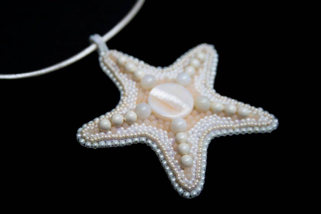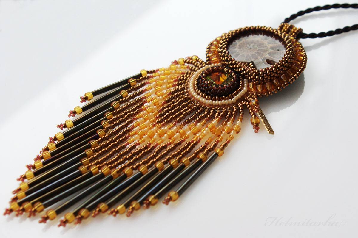 - Когда все элементы приклеены и обшиты бисером, вырезаем заготовку, края декорируем жемчужными бусинками. Нижнюю часть кулона украсим бахромой из бисера, сверху плетем петлю из бусин или просто вставим металлическое колечко.Такой кулон одинаково элегантно смотрится на атласной ленте, цепочке или жгуте из бисера.