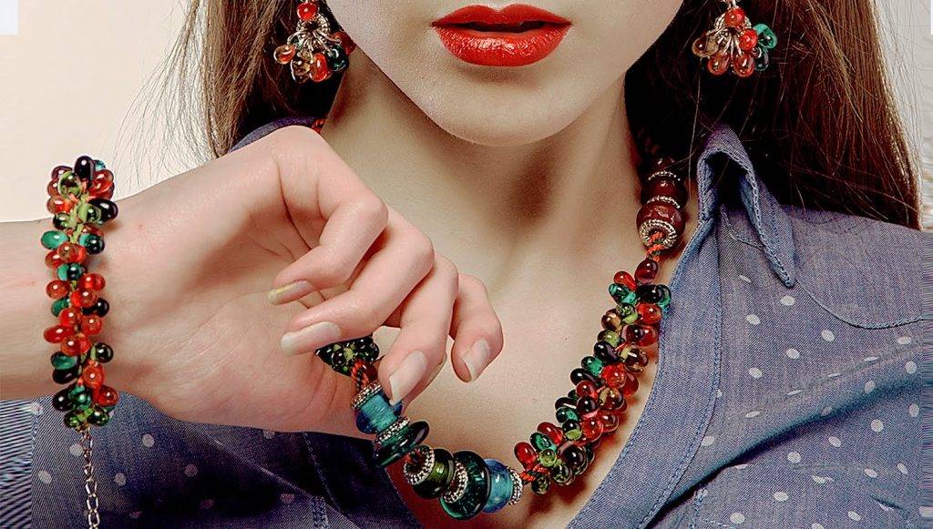 - По цвету. Если колье, ожерелье изготавливают в разных тонах, то учитывают их сочетаемость. Так, белый оттенок совместим с любой гаммой, оранжевый плохо смотрится с голубым и т.д.