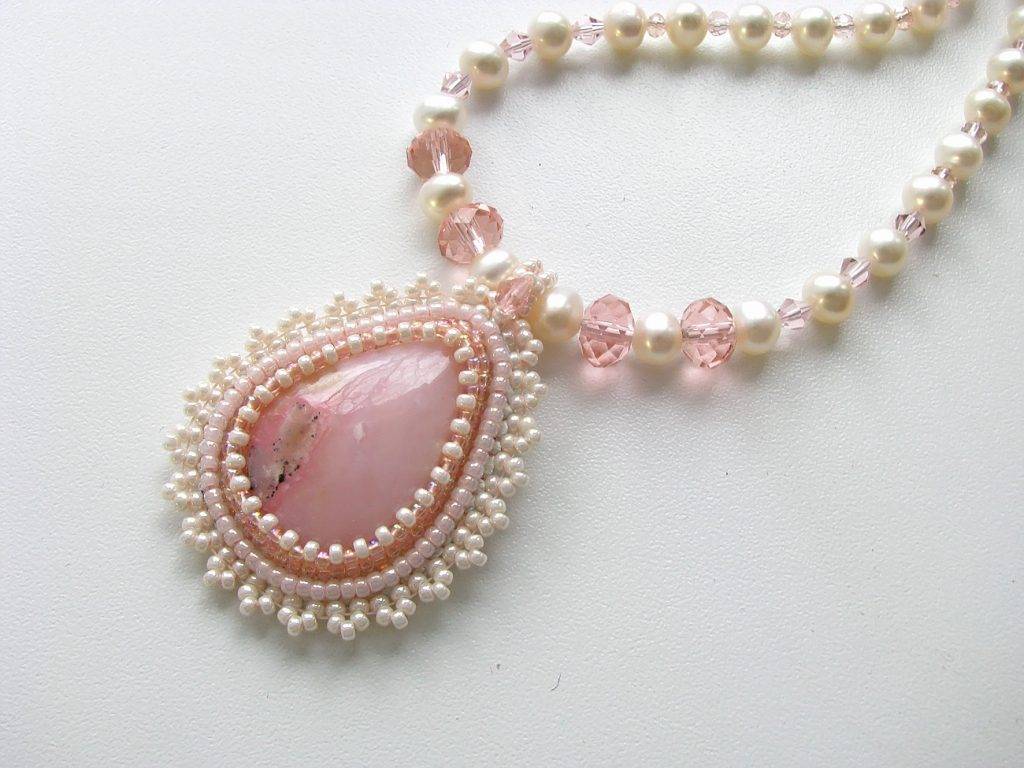 - Подготовим для работы бисер нежно-розового и кремового цвета, кабошон родохрозит, кварц и агат, жемчужные бусины, несколько риволи. Для основы потребуется отрезок ткани и натуральной кожи.