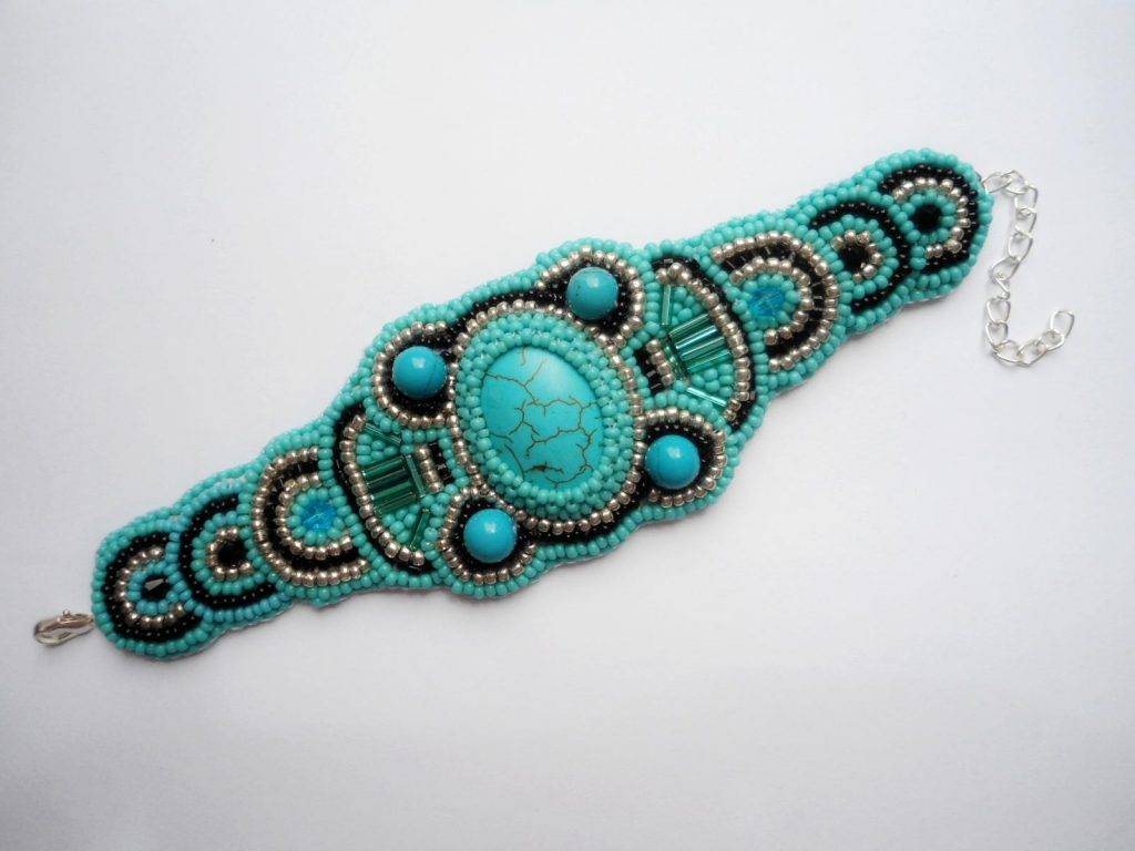 Как правило, колье или браслеты, где сочетаются натуральные камни и бусинки, выполняются в технике вышивки. Предлагаем своими руками сделать великолепный аксессуар. Для работы потребуется бисер, отрезок натуральной или эко-кожи, несколько кабошонов, красивые граненые бусины различной формы в тон, стразовая лента.