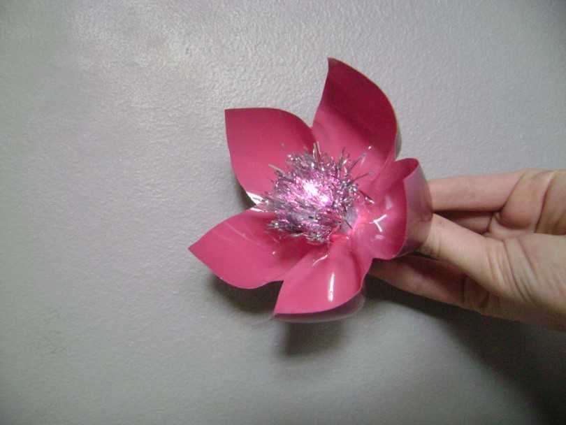 Сам стебель-стержень будет выглядеть чужеродно, если сохранит металлический внешний вид. Поэтому можете либо покрасить его в зеленый цвет, либо обернуть разрезанным на ленточки зеленым пластиком. Последнее действо сложнее, но и внешний вид получится более органичным.