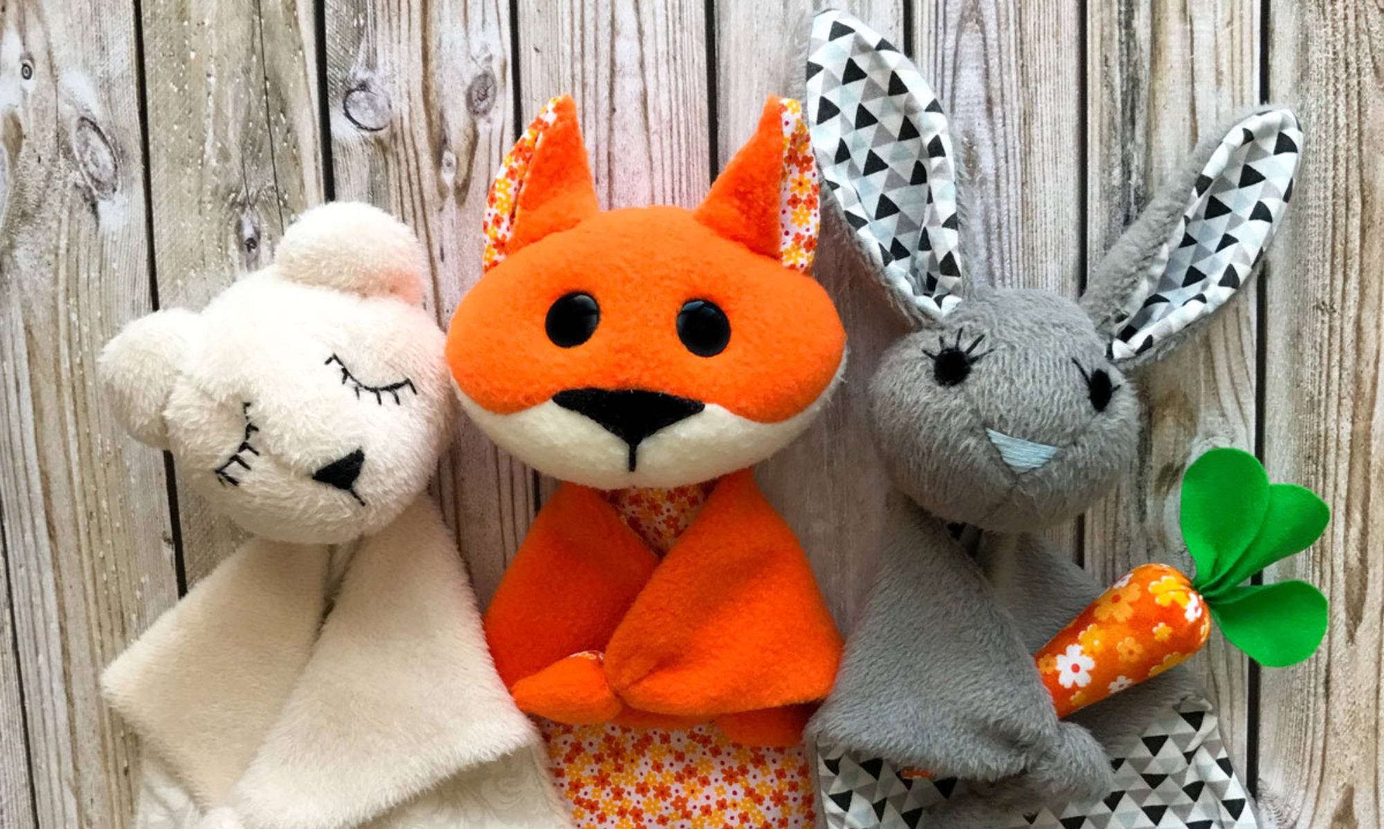 Нередко на игрушках-обнимашках делают узелки и пришивают кусочки тканей с различными текстурами. Подобные решения очень помогают: детки грызут игрушку, когда у них начинают резаться зубки, а ощупывание лоскутков способствует развитию мелкой моторики.
