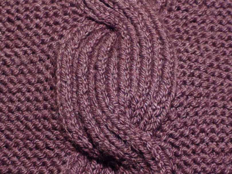 - 5 петелек провязываем лицевыми, 5 снимаем за изделием на специальную спицу, 5 вяжем лицевыми, возвращаем 5 снятых, провязываем их тоже лицевыми. Снимаем 5 на дополнительную спицу за полотном, 5 делаем лицевыми, возвращаемся к снятым и тоже вяжем их лицевыми. Завершаем 5 лицевыми.