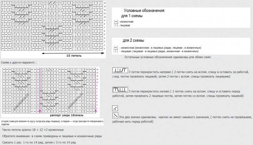 - для правильного направления узора запомните положение вспомогательной спицы: за полотном коса вправо, перед полотном – влево;