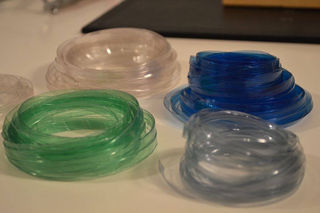 Для работы нужно нарезать бутылки ножницами на полосы, ширина которых 1 см, а длина 8.
