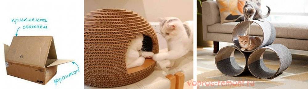 Интересно смотрятся домики из гофрированного картона для кошек, поверхность которых очень приятно царапать