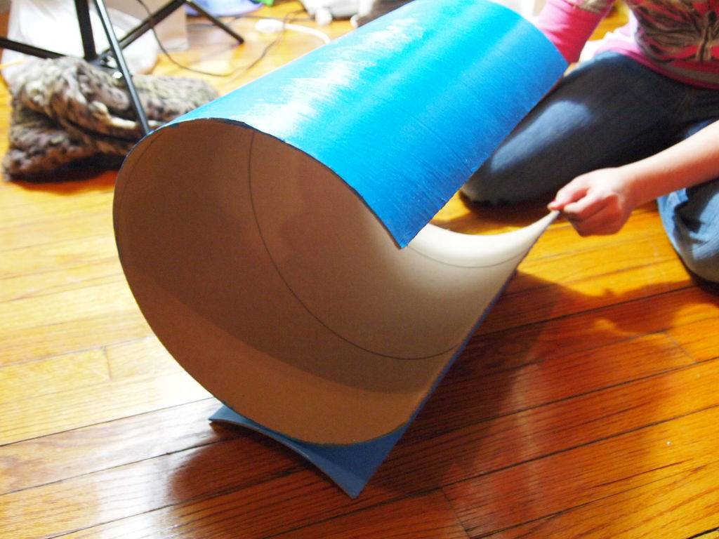 Чтобы смастерить подобный оригинальный домик для кошки, приготовьте: древесную трубку необходимых размеров (можно приобрести в строительном магазине), акриловую краску, наждачную бумагу, клей для древесины, линейку (либо измерительную ленту), кусок поролона или мягкой ткани для внутренней отделки.