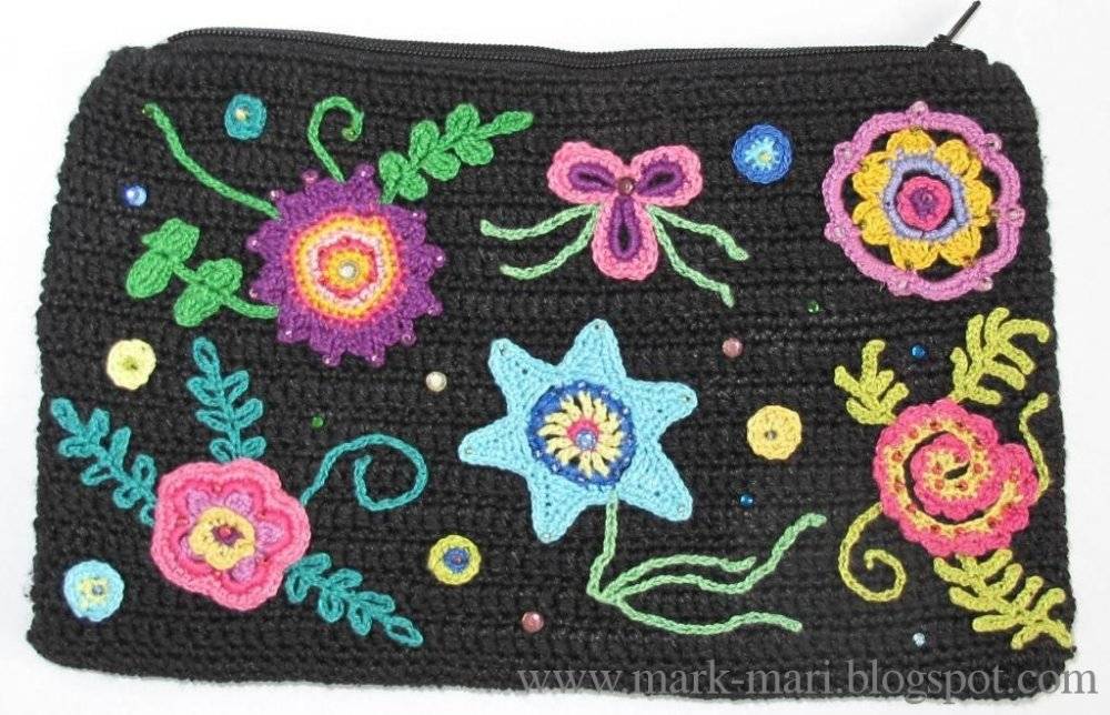 Декорируем её аппликацией из ярких цветов, которые также вяжутся крючком. Выбрав понравившуюся схему, изготавливаем одно за другим украшения. Далее отпариваем их, прячем кончики цветных ниток, размещаем на внешней стороне косметички и пришиваем к ней. В конце добавляем блеска – приклеиваем стразы.