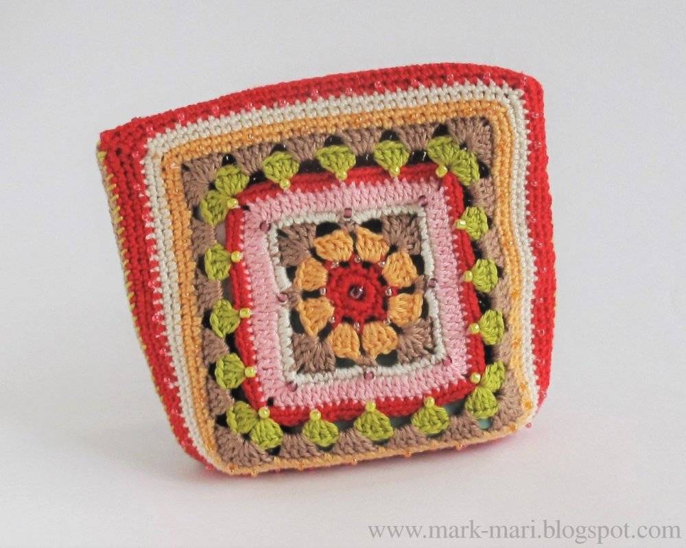 Изделие имеет квадратную форму, примерная сторона квадрата – 12 сантиметров. Лицевая сторона и изнанка вяжутся отдельными полотнами. Донышко косметички отдельно не вывязывается, но изделие всё равно будет объёмным за счёт особенностей схемы. Застёгивается сумочка на замок-молнию.