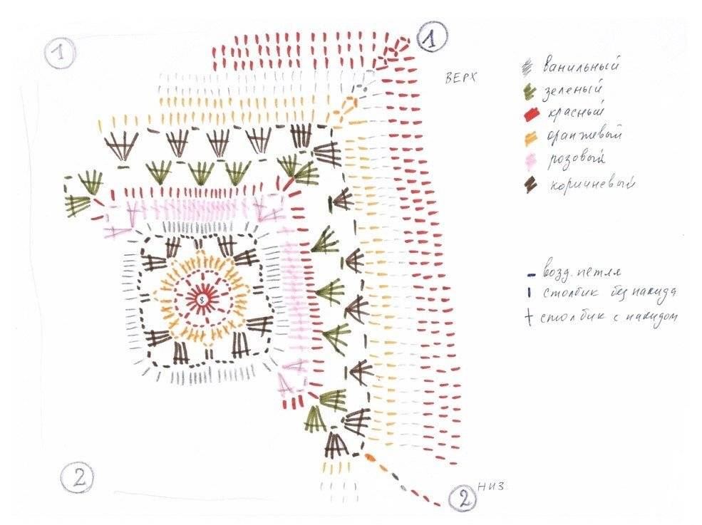 Остановимся подробнее на схеме вязания. Хитрость её состоит в том, что нижние (1) и верхние (2) углы выполняются по-разному. Отсутствие столбиков в нижних углах делает косметичку объёмной. За счёт появившегося объёма у косметички будет донышко.
