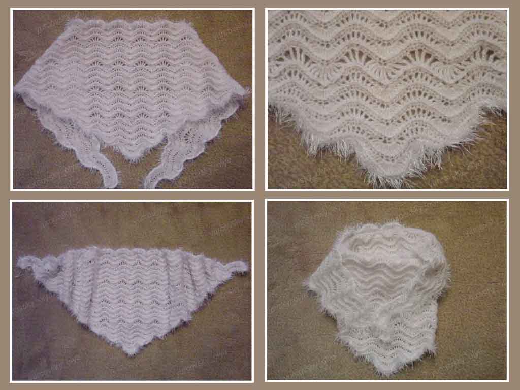 Вязание: главный рисунок даётся со схемой шали: ЦЕП. из 5 ВоздПетл., закреплённые двумя столбиками без накинутой петельки, между которыми связано по три ВоздПетл. (пико). Каёмочка выполняется зубчиками — узор вязки приведён на схеме.
