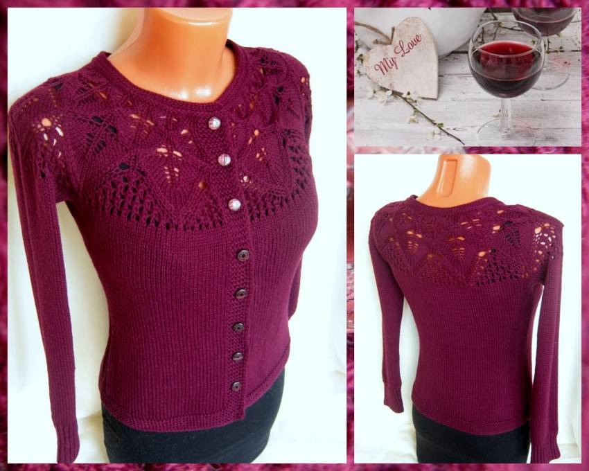 Петельки, которые будут на месте рукавов, мы переносим на вспомогательную спицу. Во время вязания нижней часть кофточки, в задней части добираем немного петлиц для образования проймы. Это будет примерно от 15 до 20 петлиц, ширина проймы может быть от пять до семи сантиметров – это зависит от того, какой размера и самой плотности вязания. От проймы нам нужно провязать 33 сантиметра лицевой гладью. Когда свяжем нужную длину, провязываем резиночкой один через один в высоту три сантиметра – закрываем все петли. Теперь переходим к вязанию рукавов. Переносим петельки на круговые спицы и присоединяем нитку, начинаем вязать лицевой гладью, но в первом рядочке нам нужно добавить петли. Так вяжем два сантиметра лицевой, а после один сантиметр платочной вязкой. То есть провязываем один рядочек изнаночными, а потом лицевыми. Через пять рядов закрываем вязание. Аналогично провязываем и второй рукав. Наша кофта готова. Данное описание достаточно подробное и поможет справиться с этой работой
