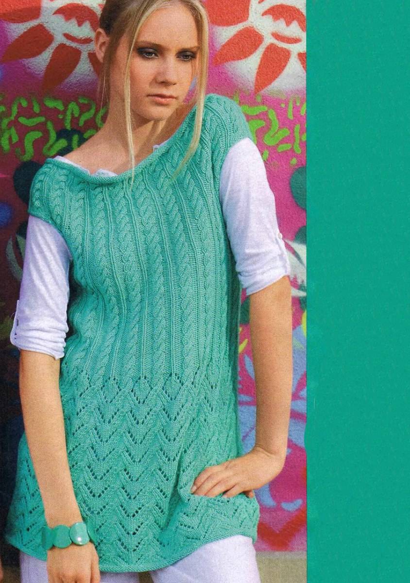 Другим достаточно распространённым узором являются косы. На фото внизу вы можете полюбоваться на топ с узором, связанным из кос, сверху которого вывязана кокетка.