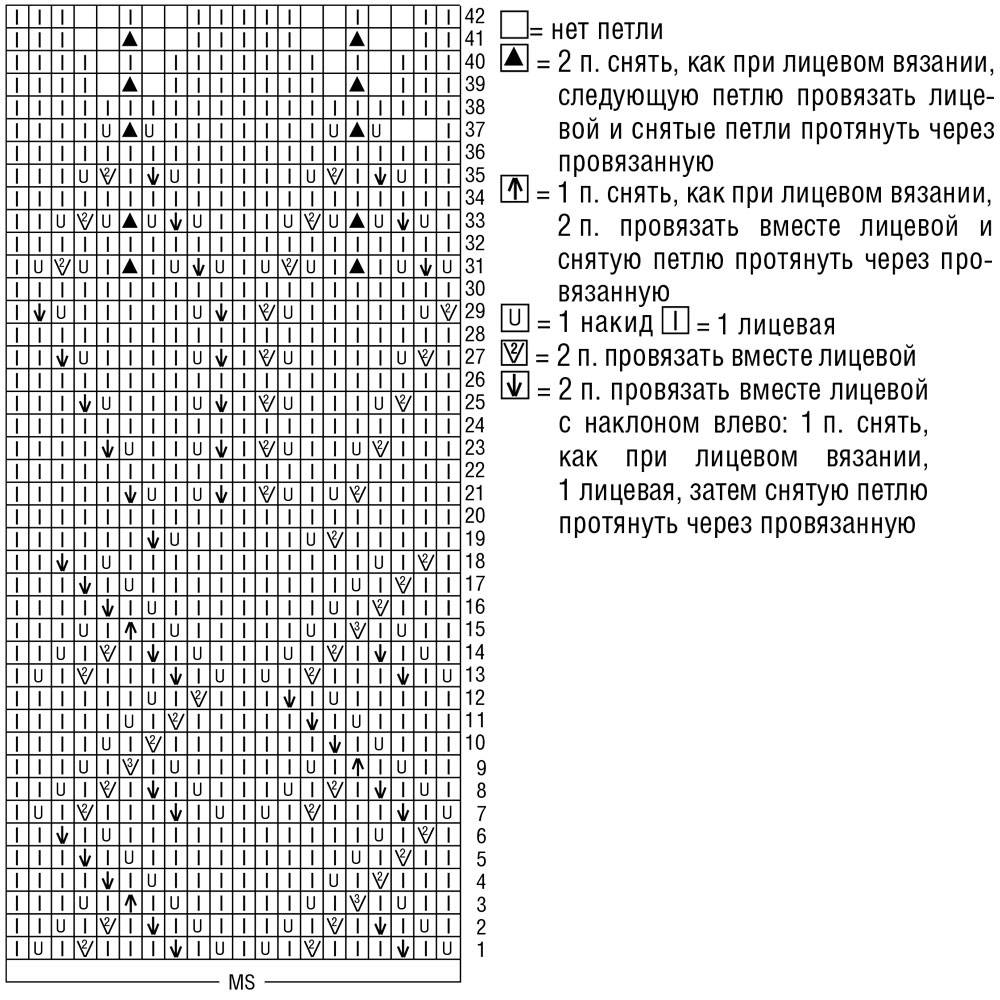 Вязание по кругу: количество петель кратно 20. Вязать по схеме. На схеме приведены нечетные и четные ряды. В ширину повторять раппорт. В высоту 1 раз выполнить с 1-го по 42-й ряд. Для 2-го размера стачала провязать 8 р. лицевыми, затем выполнить по схеме с 1-го по 42-й ряд = всего 50 р. Через 41 р. в каждом раппорте получится по 12 петель.