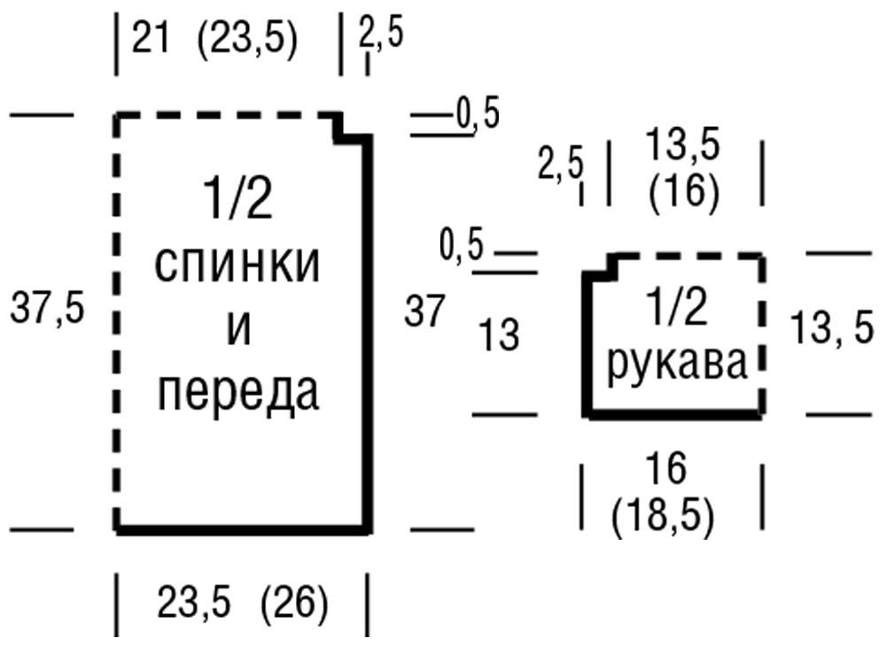 Перед и спинка вяжутся одинаково. Начать с обеих сторон регланные скосы: 2 лиц., 2 п. провязать вместе лицевой, вязать до последних 4 п. на спице, 1 п. снять, следующую петлю провязать лицевой и снятую петлю протянуть через провязанную, 2 лиц. Эти убавки повторять в каждом 2-м р. — всего выполнить 5 (6) 6 (7) раз. Петли перевести на вспомогательную нить и закончить вторую сторону.