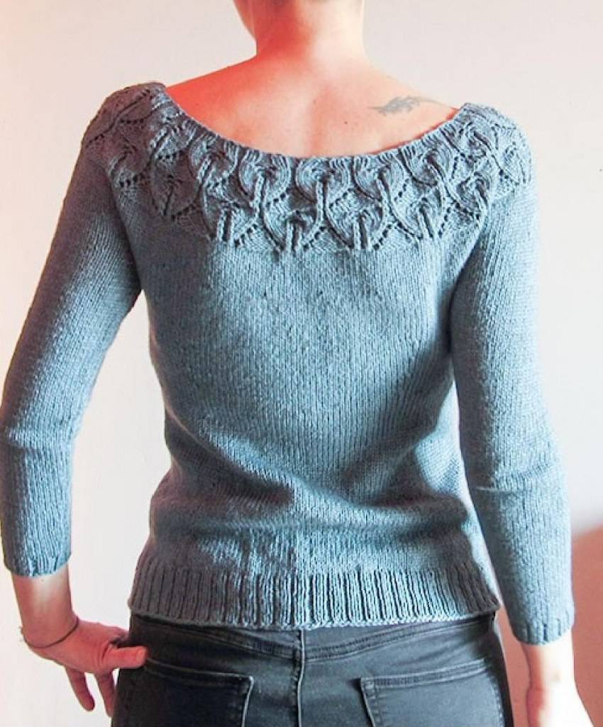 Легко будет вязаться узор с углами вроде треугольников или листочков. Слишком ажурная кокетка будет просвечивать, поэтому под ней потребуется дополнительный слой одежды.