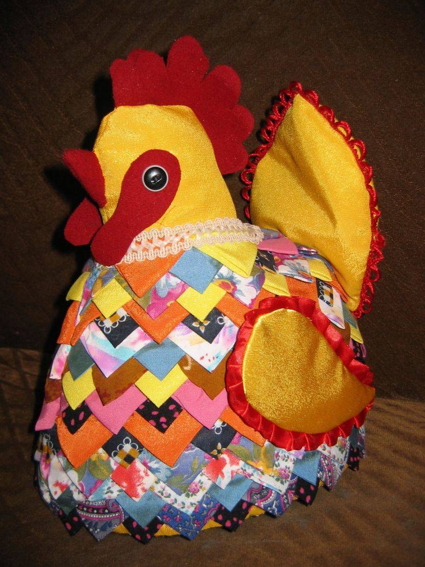 - ткань – желательно для работы взять яркую ткань, чьи узоры будут похожи на оперения курочки.