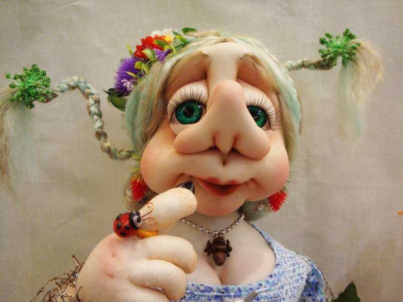 - Лицо куклы создается с помощью стежков, которыми капрон стягивается в нужных местах. Так получаются брови, нос, носогубные складки, губы и подбородок. Далее, ей делают макияж. Глаза куколке можно нарисовать или пришить готовые