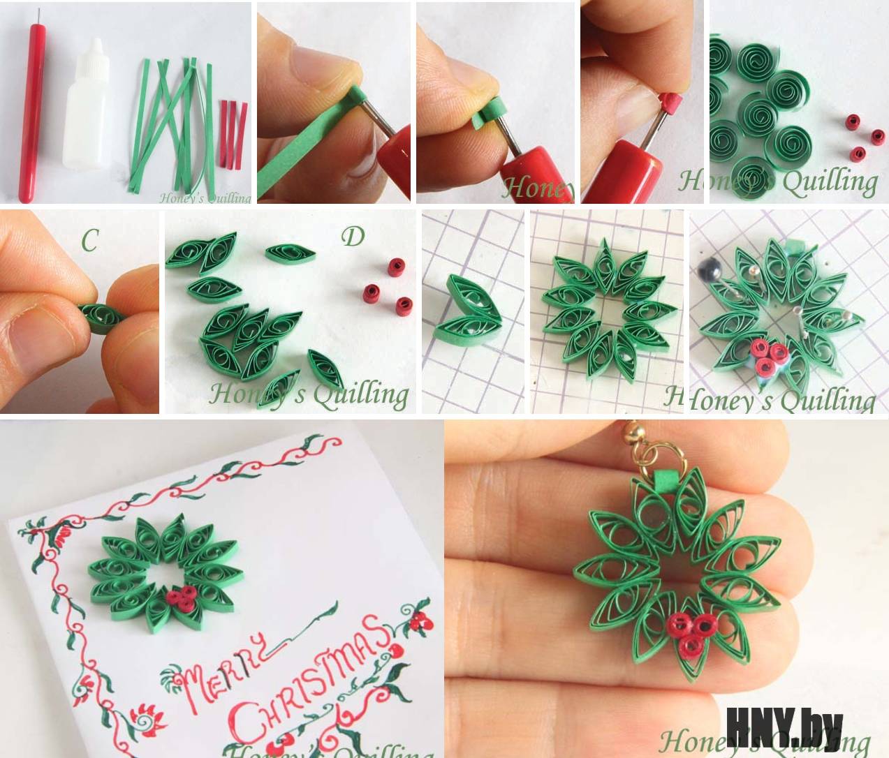 Весьма простая поделка, с созданием которой без проблем справятся новички. В поделке используются два базовых элемента: тугая спираль и глаз. Готовый венок можно использовать для декора открытки, а если с одного из краев приклеить петельку и продеть крючок для сережек – получиться отличное тематическое украшение для новогодней вечеринки.