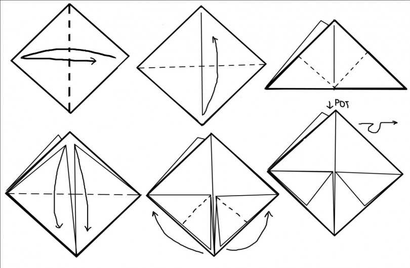 - Модель складывается пополам по длине, затем половина квадрата отгибается в обратную сторону.