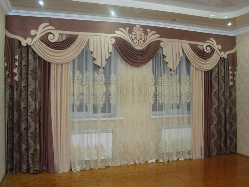Например, в просторном и светлом помещении с высоким потолком уместны роскошные тяжелые шторы с подхватами и ламбрекен с пышными драпировками. Если комната имеет скромные размеры, больше подойдут тюлевые занавески с незамысловатым ламбрекеном из мягких тканей.