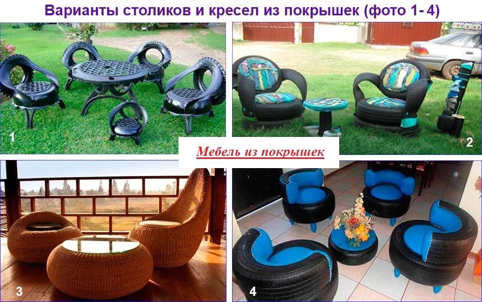 Использованные покрышки идут в дело у дачников не только для устройства клумб и малых архитектурных форм. Такой материал не оставили без внимания и приверженцы практицизма в дизайне. Мастера изготовляют замечательную мебель из покрышек. Это не только простые пуфы, но и более сложные кресла и столы в колониальном стиле. Дополняют такие ансамбли качели на детских площадках и ограждения из шин.