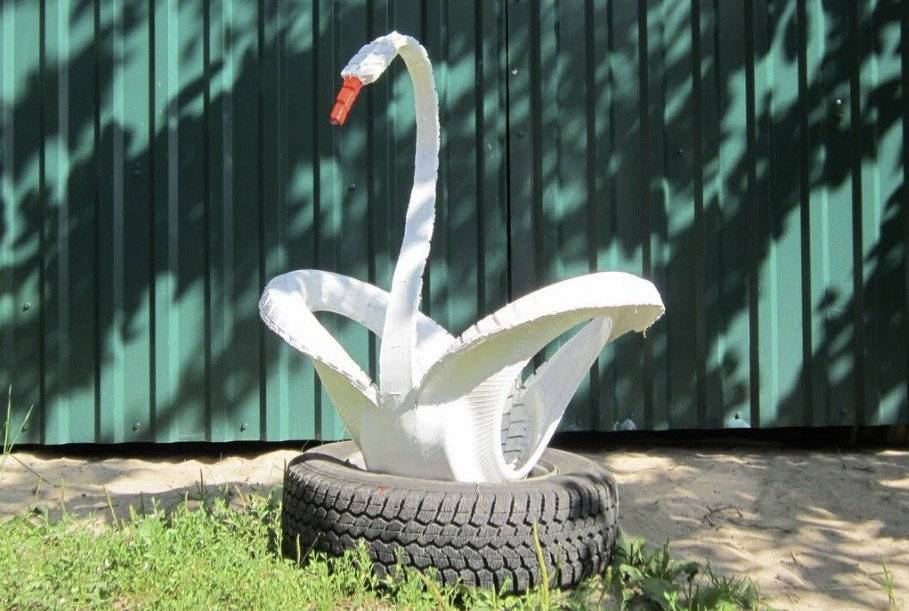 Лебедь из шин, пластиковых бутылок и пенопласта