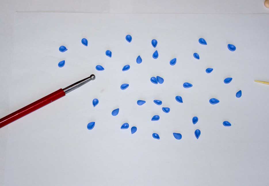 Из этих кусочков сделаем лепестки. Для этого берем каждый кусочек, скатываем в шарик, немного сплющиваем между пальцами и с помощью стека с шариком чуть продавливаем в центре, а потом сбоку прижимаем пальцами — получается лепесток.