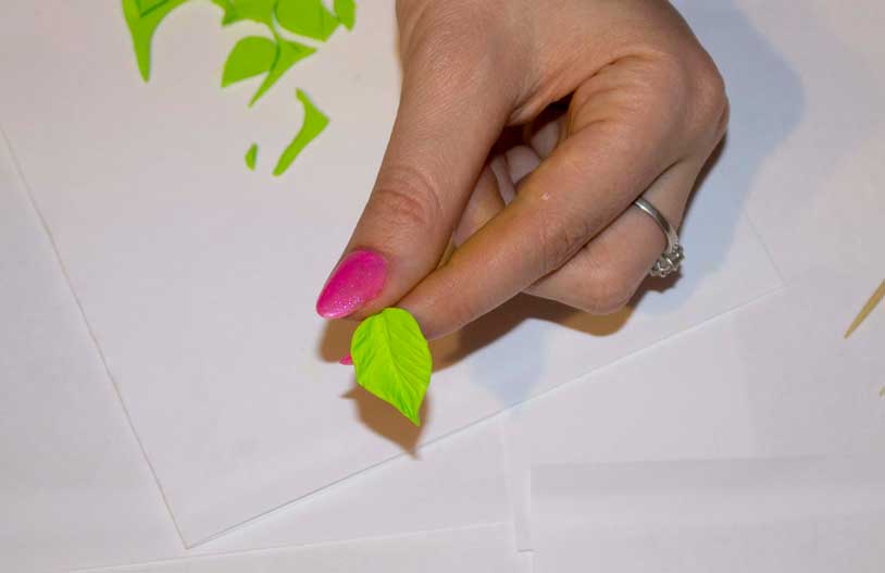 Далее берем полимерную глину различных оттенков зеленого цвета и приступаем к изготовлению листиков. Листики можно лепить вручную, а можно взять кусочек пластики, раскатать в пласт и скальпелем вырезать форму листиков различных размеров.