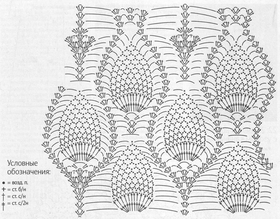 - Пятый-шестой ряд начинаются с трех воздушных петель. Дальше вяжем по схеме: в два ст. с/н нижнего ряда сделать по одному столбцу с/н и по одной в.п. Узор повторяем.