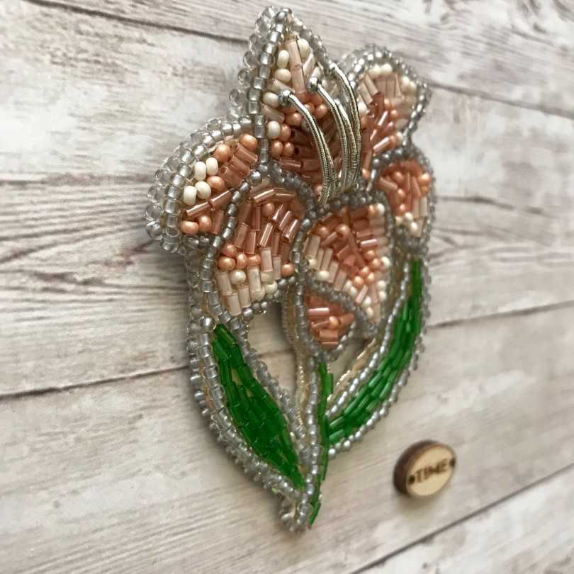 Брошь в виде объемной лилии неизменно будет привлекать внимание окружающих. Параллельным плетением можно сделать плоское украшение, прикрепив на застежку.