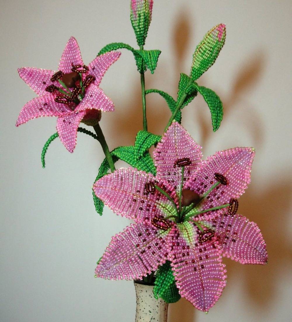 Однако, более впечатляюще будет выглядеть букет, который полностью составлен из лилий, изготовленных из бисера. Но для этого нужно позаботиться о создании длинных стеблей. Их можно сделать из проволоки, обмотанной зеленой бумагой или сформировать стебель из бисера.