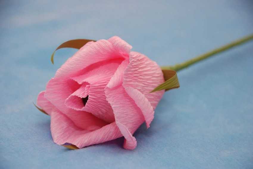 Из гофрированной бумаги зеленого цвета подготавливается полоска длиной 30 см с толщиной 1 см. зафиксировать полоску на конце стебля и постепенно накручивать бумагу со сдвигом, закрывай проволоку. Чтобы бумага не съезжала, стоит предварительно смазывать ее клеем. В конце зафиксировать клеевым пистолетом.