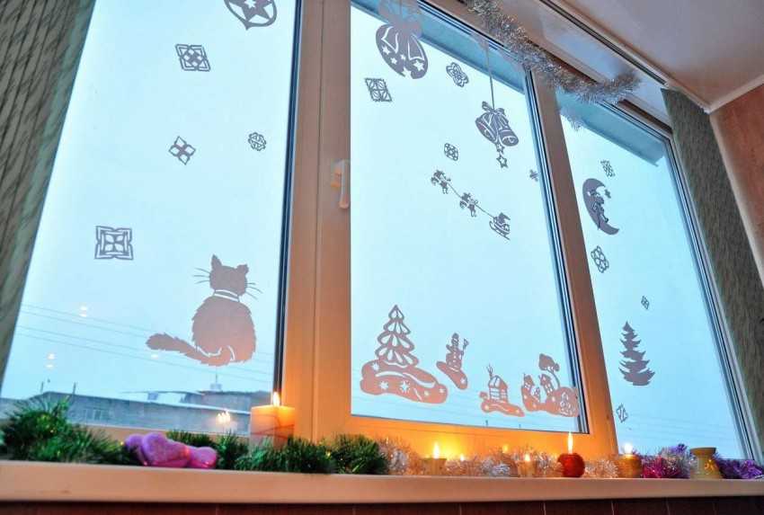 Для работы вам понадобятся карандаши, калька, ножницы и гирлянда на светодиодах. Склейте листы так, чтобы в длину они достигли размера вашего оконного проема.