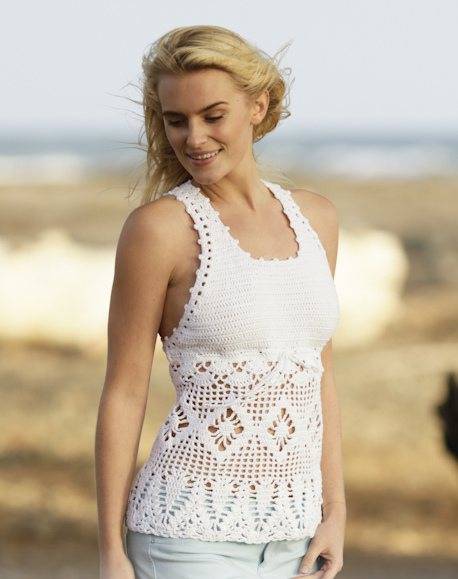 Получившаяся ажурная маечка станет отличным дополнением к джинсам, юбке или шортам.