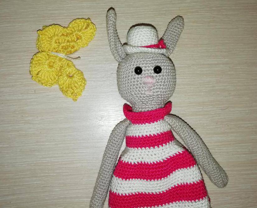 Начинаем вязать с туловища: делаем с помощью крючечка 5 воздушных петлиц, образуем колечко. В этом кольце необходимо сделать 7 столбцов без накида. Когда уже провяжется 6 см, тело нашей бабочки нужно будет набить синтепоном.