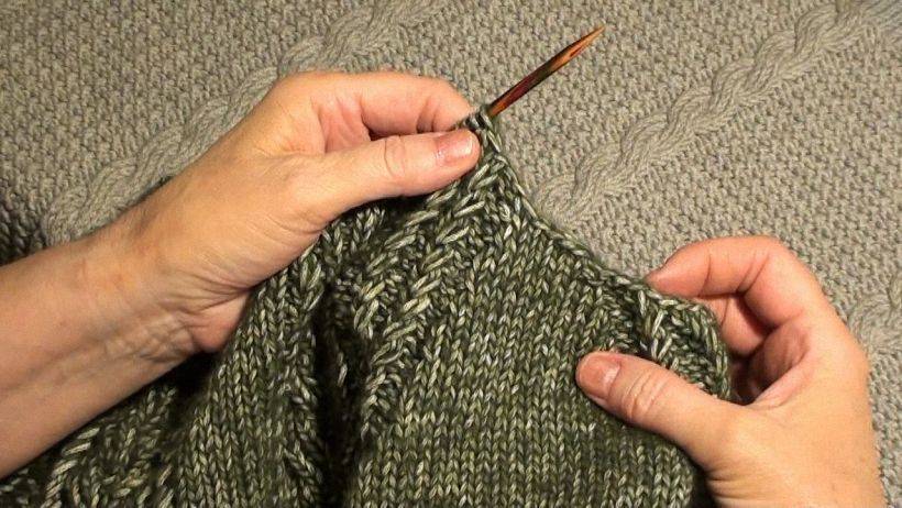 - Достигнув уровня подмышки, 2 см далее вяжут поворотными рядами перед и спинку, чтобы свитер сидел ровно без перекосов.
