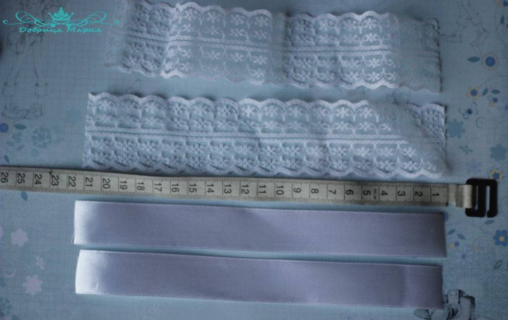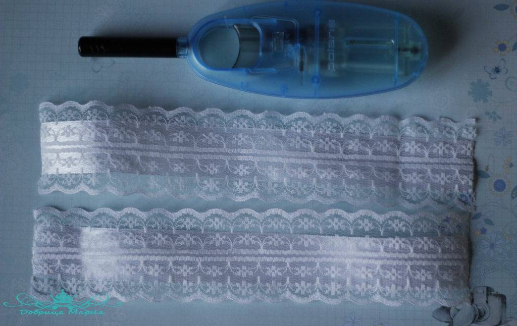 Для нижней части банта берем 2 отрезка кружева 4 см. ширина и 2 отрезка атласной ленты 2,5 см. ширина и длиной все отрезки по 21,5 см.