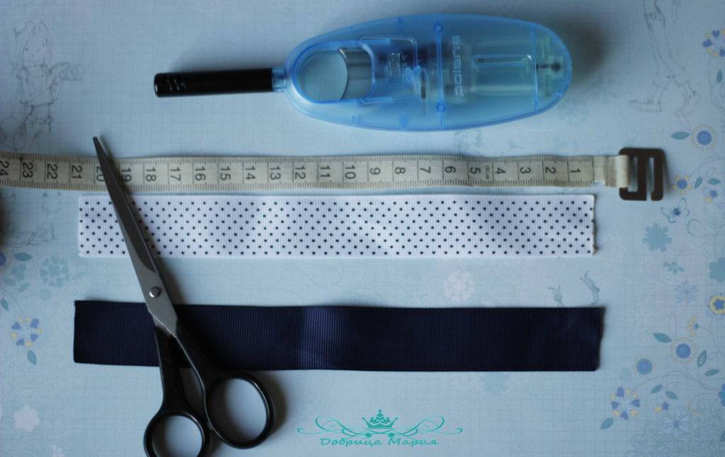 Чтобы сделать по один бантик из репсовой ленты с рисунком «Морячка», подготовьте материалы: