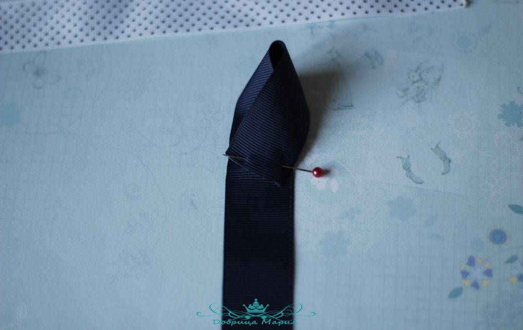 Сделай загиб на расстоянии 6 см от края и подверни ленту по этой линии углом, чтобы она смотрела вниз. Верни край обратно вверх, а оставшийся конец подогни сзади и сделай такой же треугольный загиб. Вторая деталь делается по тому же принципу, только зеркально: отмеряй 6 см с другого края. Стяни заготовки ниткой, сшей между собой и прикрепи к резинке или заколке.