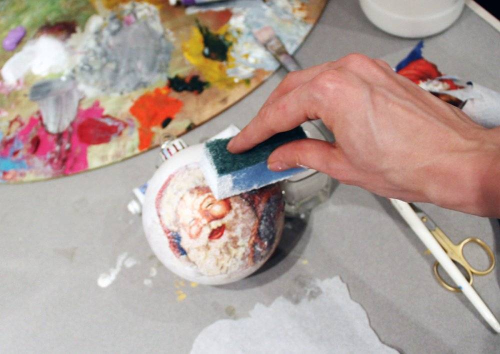 - Полученную эмульсию нанесите однородным слоем на поверхность шара, используя губку. Благодаря данной технике получится снежный эффект, актуальный для новогодней тематики.