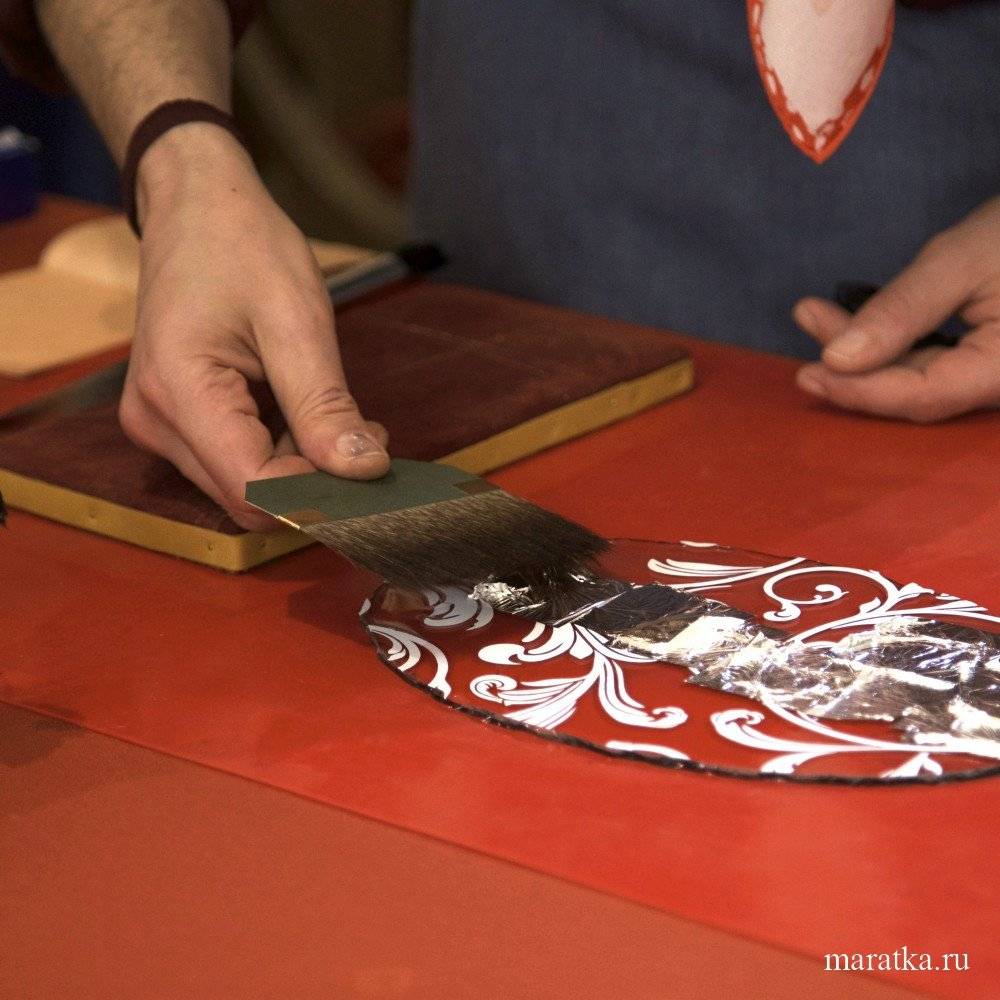 Эта техника относится к отряду живописи под стеклом. Суть в том, что мы на стекло при помощи клея наносим фольгу, затем выполняем гравировку тонкой иглой. Далее, удаляем фольгу с тех мест, где должно находиться изображение, и красим узор краской. В итоге, на стекле мы увидим узор на золотом или серебряном фоне.