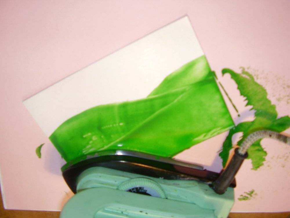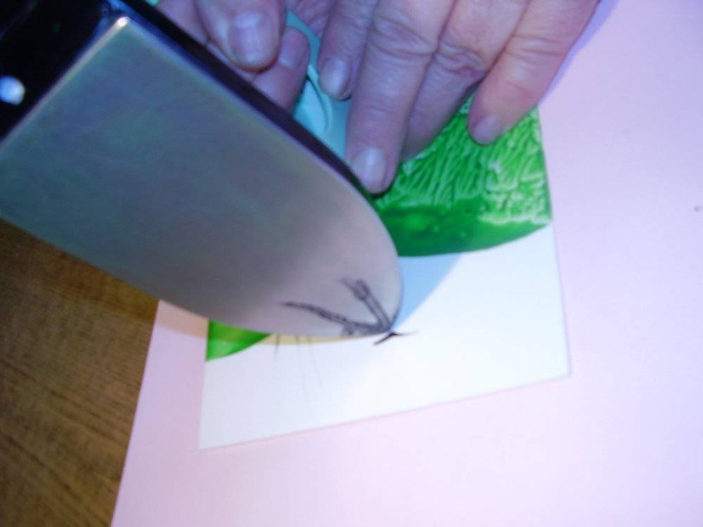 Разглаживание. Утюг следует повернуть подошвой вверх, по ней нарисовать восковым карандашом. Воск должен слегка течь, если он растекается сильно, то нужно уменьшить температурный режим. После того как закрашена вся поверхность, поверните утюг в нормальное положение и проведите по картону. При этом используйте небольшой нажим и маленькую скорость движения.
