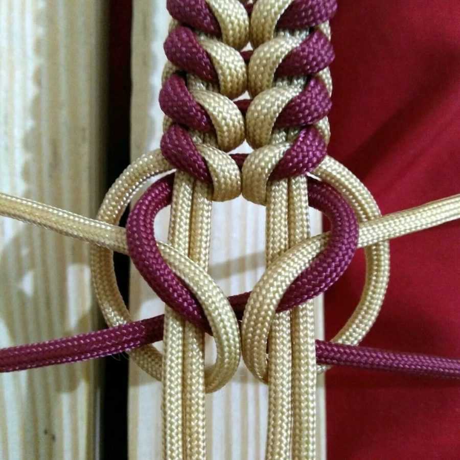 На основе этих узлов делается и квадратный. Для его плетения необходимо закрепить концы четырех нитей, можно разноцветных. Две средних нити будут оставаться в середине и служить для объема, вокруг которого две другие нити будут образовывать вертикальную полосу из череды плоских узлов. Таким способом можно оплести и любой твердый предмет — рукоятку для ножа или трости, ручку для сумки, основу для гардины.