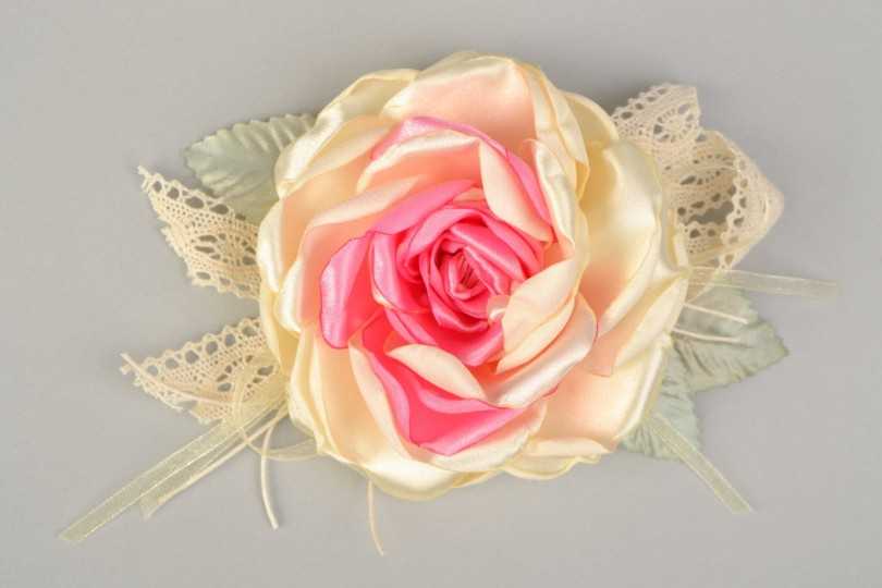 - Композицию из тканевых цветов можно украсить несколькими витками атласной ленты. Края ленты обработайте зажигалкой, чтобы они не растрепались.