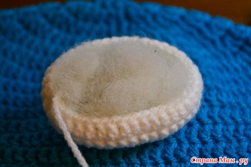 1)Голубой пряжей с помощью столбцов с одним накидом, вяжем круг, диаметром около 15 см.
